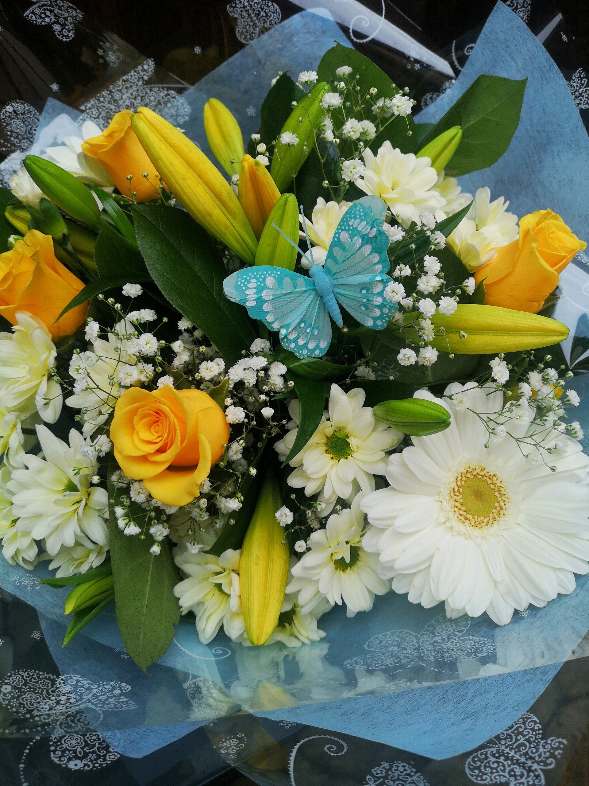 A Pastel handtied bouquet in Blue, lemon and white, or pink and white
